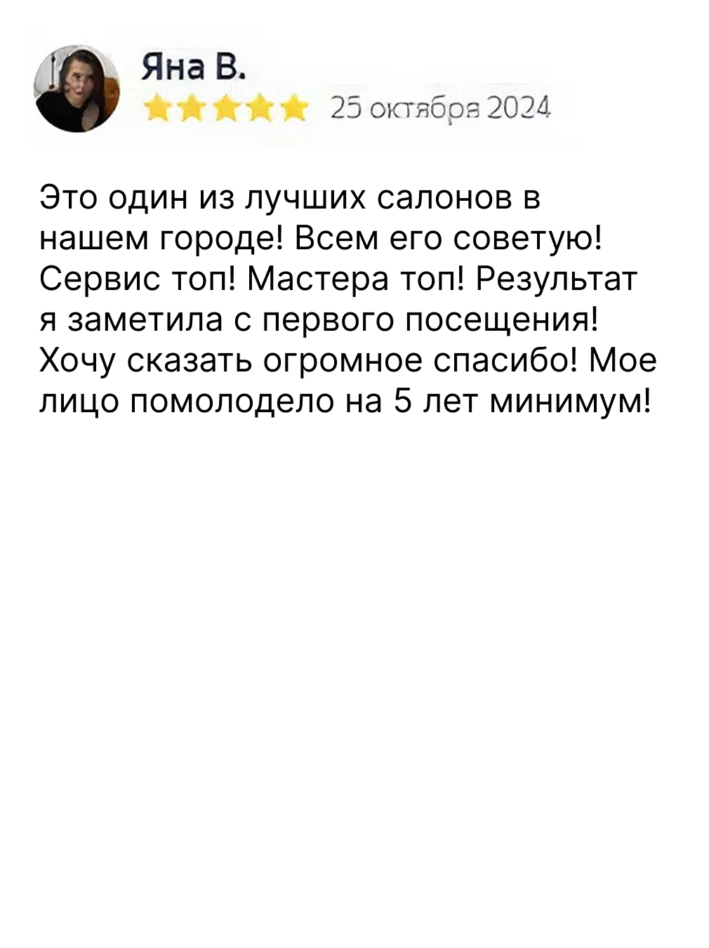 Мы постоянно совершенствуемся и стремимся дарить вам уверенность и вдохновение. Ваша красота — это наша радость, и мы всегда рядом, чтобы поддержать вас на этом пути.